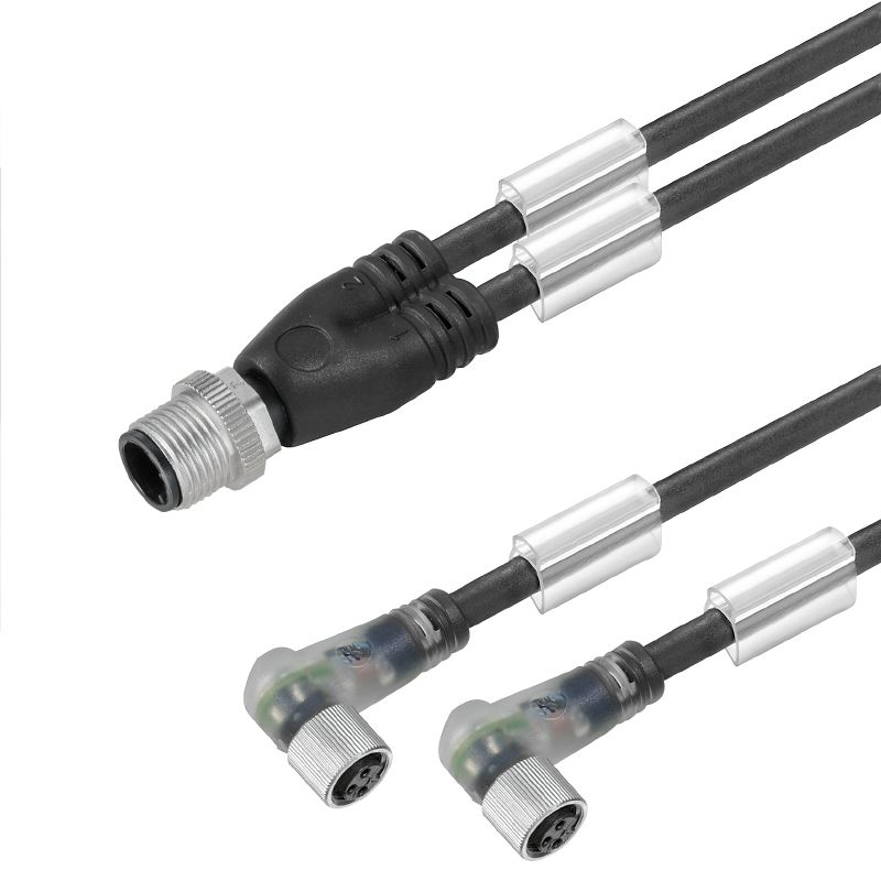 Câble capteurs/actionneurs, Câble de raccordement, M12 / M8, Nombre de pôles : 3, 5 m, Câble double, mâle, droit, 2 x femelle coudée, Blindé: Non, LED: Oui, Matériau de la gaine: PUR, Halogène: Non
