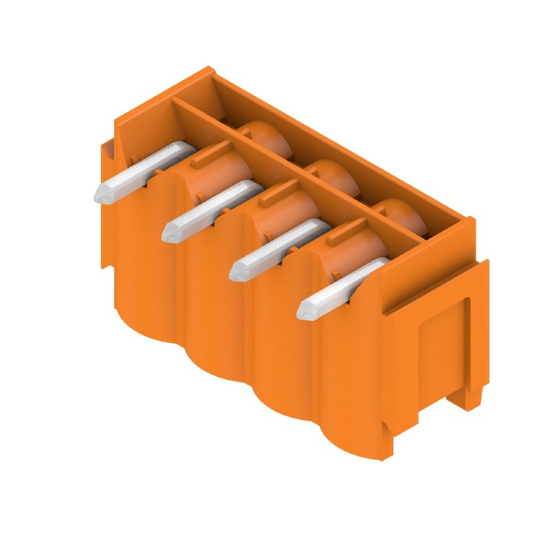 PCB plug-in connector, male header, Dovetails for fixing blocks, THT solder connection, 5.00 mm, Number of poles: 4, 90°, Solder pin length (l): 3.2 mm, tinned, orange, Box